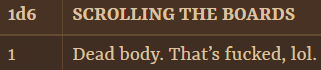 There’s a game in that. Not a pleasant one, but a game. Something to experience with pen and paper, and maybe a singular die. A journey to have.