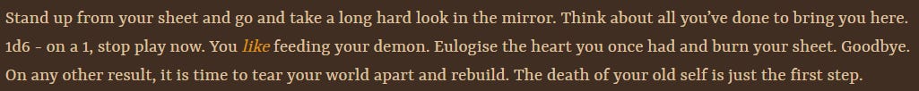 It was about this point I was determined to publish the game on the same day. I couldn’t sleep on this, it would dampen it. It needs to be out and it needs to be out now. The mechanics were simple and got out the way - I think this is far closer to a lyricgame than a traditional RPG - and so I just kept writing, kept spitting the poison out until eventually my mouth runs dry and refills with healthy word. Those last few words of honesty rounded out the healing end of the game, and from there it was just a job of formatting and PDF-ing the text.